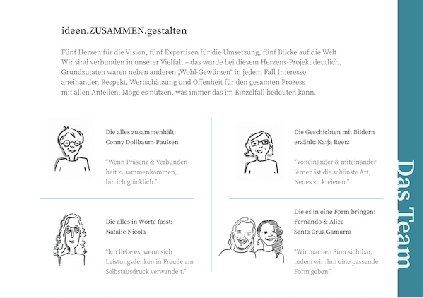 Uns war schnell klar, dass es nicht darum geht, ein Adressheft zu gestalten. Und darin waren wir uns auch alle einig. Wir wollten eine Broschüre, die inspiriert, die die Menschen einlädt, sie in die Hand zu nehmen und durchzublättern. Wir hatten die Vision, dass diese Broschüre mit ihren Beiträgen Resonanz erzeugt und so die richtigen Menschen zueinander finden können.