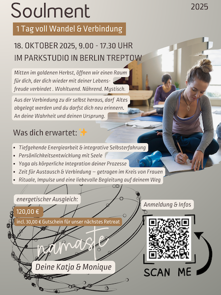 Ich bin stolz auf unser Soulment-Tages-Workshop Mitte Oktober in Berlin. Was für eine schöne Erfahrung 100% all in zu gehen und gemeinsam mit Monique Wissen und Erfahrungen zu teilen und Verbundenheit zu erleben.